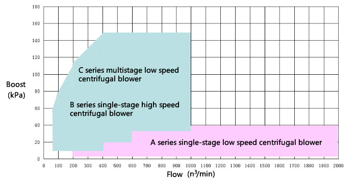 The performance range of blower could be determined approximately by capacity and pressure as drawing show, plus another conditions, a precise model could be confirmed by professionals.