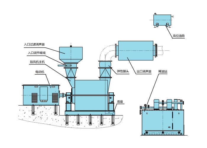 *For the blower with rolling bearing, the lubricating device is included in the blower, for the blower with sliding bearing, the thin oil station is equipped.