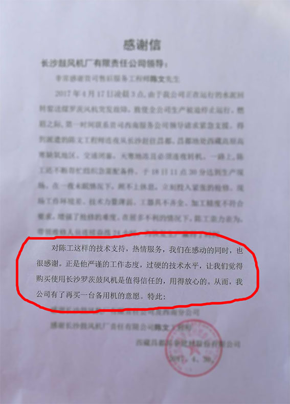 其实,今年以来,售后服务部对客户需求的服务质量已经得到了业务人员的普遍认同,也得到了客户的肯定,“五一”假期,安徽用户在4月29号下午向公司反映风机出现故障,5月1号上午,服务人员钟斌就到达客户现场并找出了问题所在,提出了解决方案,连用户都对我公司的服务速度点赞;客服部李长庚副总,凌晨1点向客户反馈处理情况,客户为此专门致电贵州办事处,对我公司的服务表示感谢……很多这样的事例,体现出公司对服务工作的改进力度,也体现了公司对客户利益的重视。