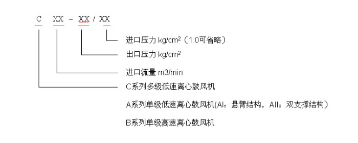 C300–1.7/1.0 表示在温度20℃,进口压力1.0kgf/cm2(98kPa)相对湿度50%的进气条件下,进口流量为300 m3/min,出口压力1.7kgf/cm2(升压68.6kPa)的多级离心欧陆娱乐。